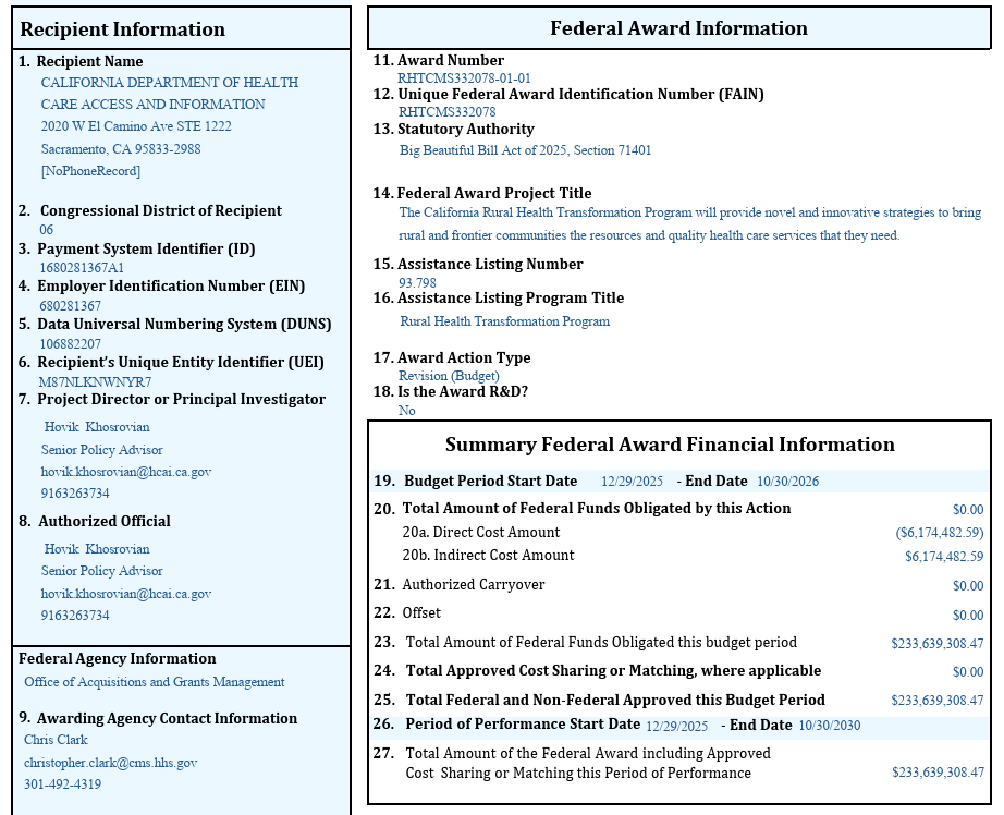 This Notice of Award approves the revised budget and partial lift of restriction in the amount of $183,639,308.47 per your request dated 01/30/2026. The line items listed below will remain restricted in the “Other” cost category until CMS receives additional information: Transformative Payments to Support Strategically Located Hospitals $50,000,000 Recipient Specific, Program, and Standard Terms and Conditions remain in effect.