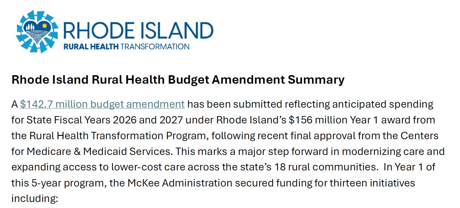 Rhode Island has filed a $142.7 million budget amendment SFY 2026–2027, reflecting spending plans under the state's $156 million Year 1 RHTP award following final CMS approval. The top-line allocation goes to value-based payment transition ($32.2M) and rural workforce ($28.0M), followed by health IT modernization ($16.7M) and the state's novel hospital-at-home program ($16.2M). The budget also bakes in a policy reform package that includes rolling back Certificate of Need requirements, expanding scope of practice for pharmacists and dental hygienists, and joining interstate licensure compacts — all conditions to keep the full federal award flowing.
