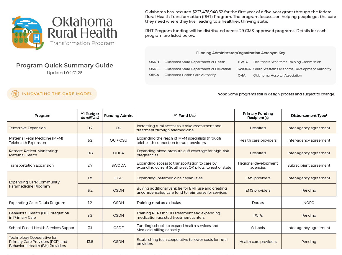 Oklahoma published an updated Program Quick Summary Guide on April 1 laying out all 29 CMS-approved RHTP programs with confirmed Year One budgets and disbursement status for each. The $223,476,949 first-year allocation is now mapped program-by-program, and the procurement picture is sharper than any state has published to date.