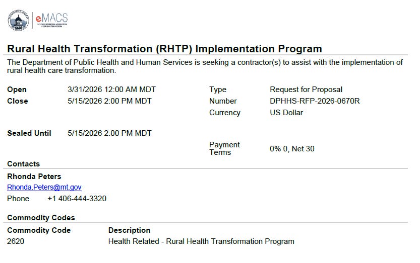 The Department of Public Health and Human Services (DPHHS) is seeking proposals for two distinct components of Montana’s Rural Health Center of Excellence (CoE) as part of the new Rural Health Transformation Program (RHTP).