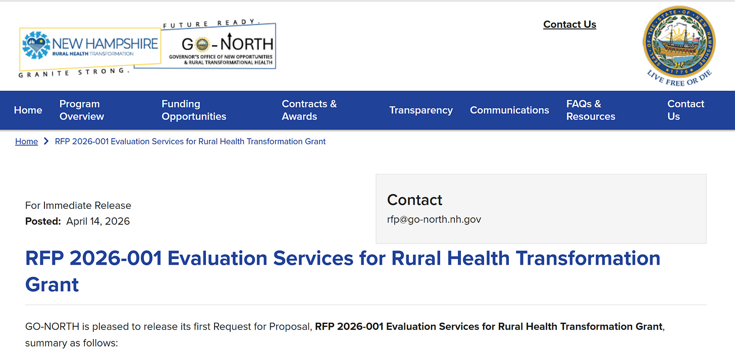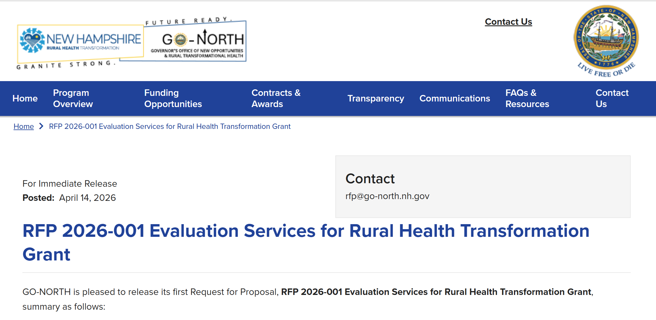 New Hampshire’s GO-NORTH program releases its first RFP: Evaluation Services for Rural Health Transformation Grant