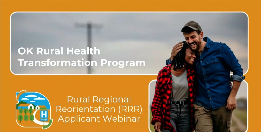 Oklahoma State Department of Health posted the Rural Regional Reorientation (RRR) NOFO on April 20. In a companion applicant webinar, OSDH Program Manager for Health Systems Nicole Hall laid out the program’s terms: $20 million in competitive grants of up to $4 million per application to clinical and social service providers serving communities under 55,000 — partnerships preferred but individual applicants eligible. Year 1 participation is not a prerequisite for Years 2–5, which OSDH says will emphasize “coordinated and sustained partnerships that require more intensive planning.” Priority for Year 1 goes to shovel-ready projects demonstrating impact within 12 months, with all funds expended by September 30, 2027.