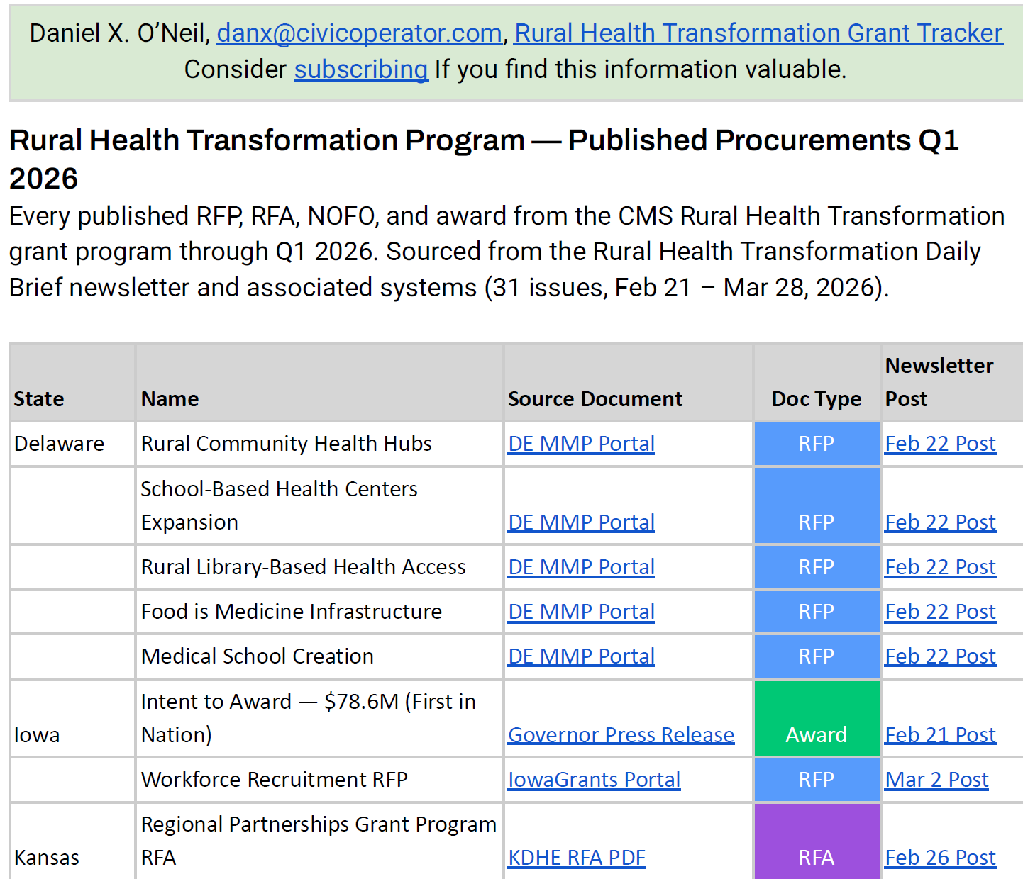 Every published RFP, RFA, NOFO, and award from the CMS Rural Health Transformation grant program through Q1 2026. Sourced from the Rural Health Transformation Daily Brief newsletter and associated systems (31 issues, Feb 21 – Mar 28, 2026).