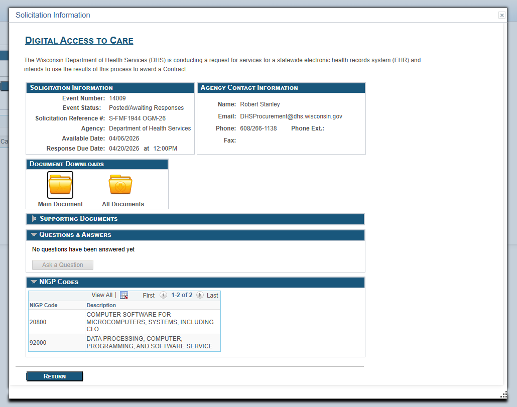 DHS is seeking proposals for a statewide electronic health records (EHR) system. The selected vendor will build a system to transform how providers interact with each other and with patients. The goal is to facilitate high-quality care for patients in rural Wisconsin. The selected vendor will design, implement, maintain, host, and manage a full-service EHR system in partnership with DHS and participating providers. The system will give providers the option to join a shared system with appropriate facility and provider-specific customizations, privacy, and security. The system will enable provider organizations to upgrade existing clinical and revenue systems and achieve economies of scale through a single statewide procurement.